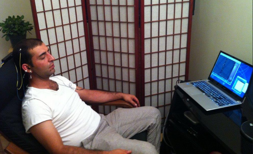 Je gaat zitten in een comfortabele stoel en krijgt vijf sensoren bevestigd op hoofd en oren.